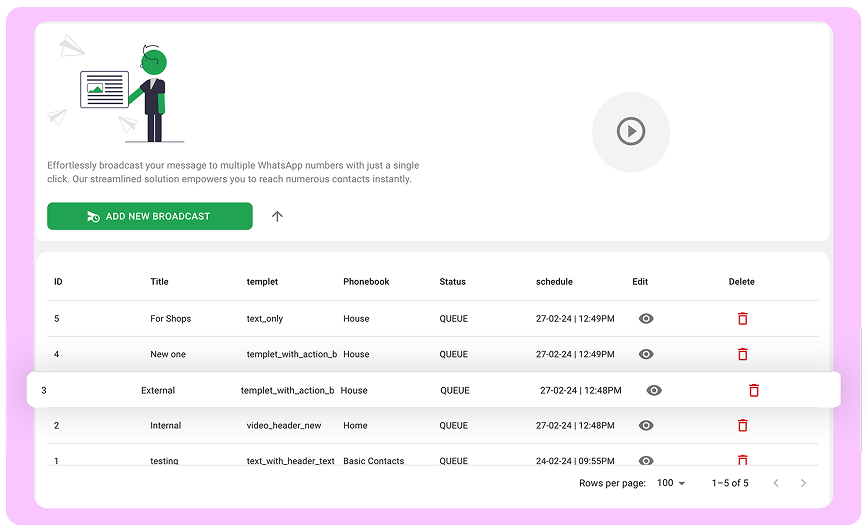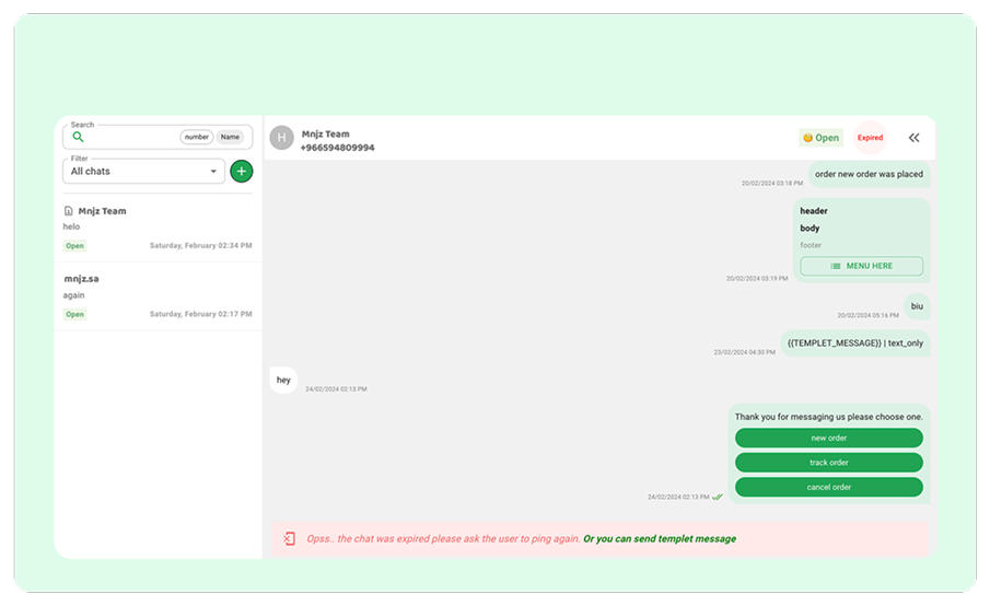 قم بالتسويق عن طريق الواتساب من خلال القوالب المخصصة من قبل ميتا والتي يمكنك بناءها بنفسك او من قبل احد من فريقك، يمكنك انشاء قوالب للتسويق لمنتجاتك او خدماتك او ارسال احد العروض لديك مع ضمان الموافقة السريعة على القوالب التي تقوم أنت او فريقك بأضافتها على منصة منجز شات، نوفر افضل تجربة للتسويق عن طريق الواتساب، ابدأ تفاعلك مع عملاءك وكن قريباً منهم حترر يمكنهم الاتصال بك في أي وقت، او يمكنك ارسال اخر عروض منتجاتك وخدماتك.